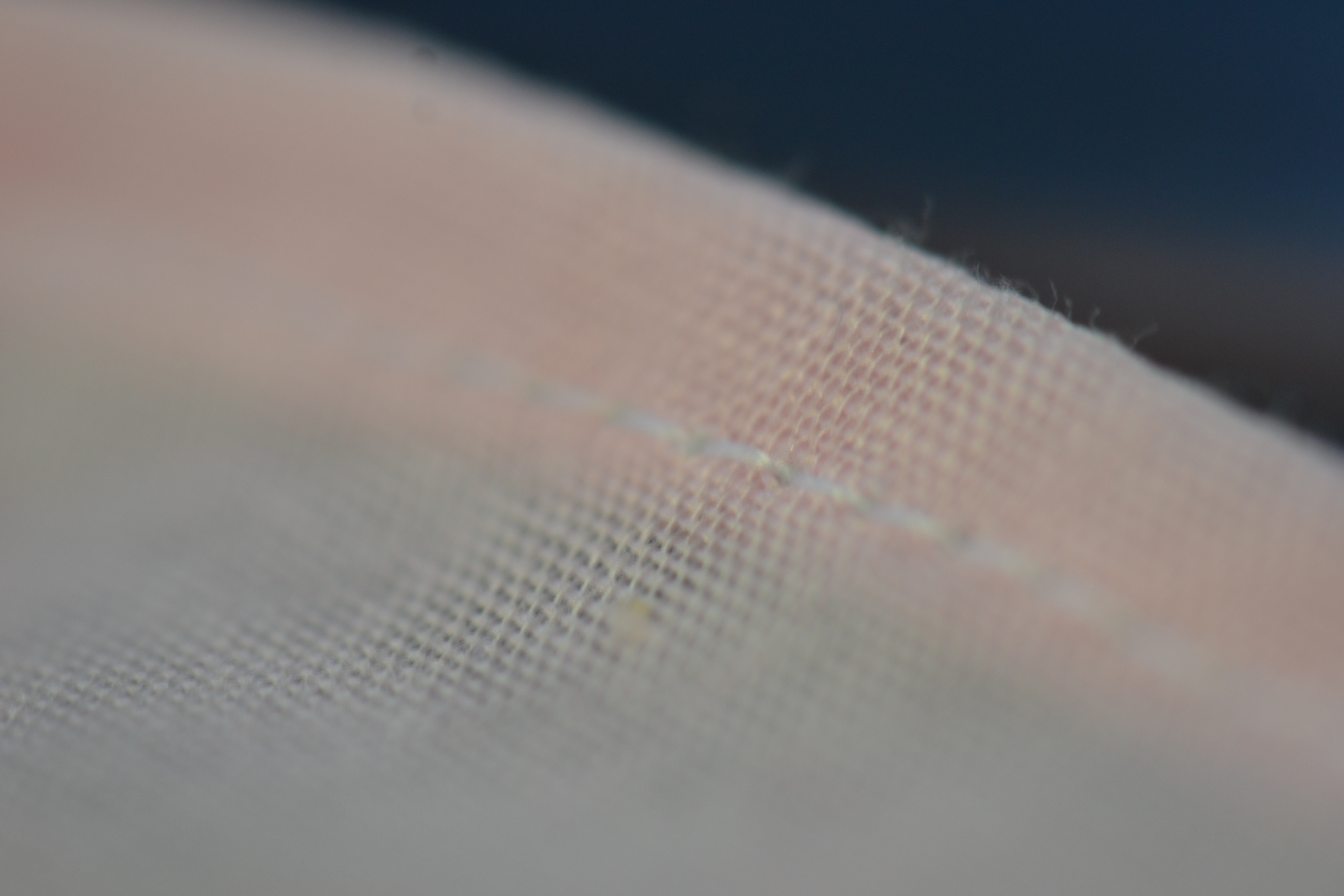 Now fold the hem up again along the second row of stitches. It should roll quite easily for you. You shouldn’t have to press it. Stitch along the top edge of the hem once again being as accurate as possible. If you’ve been careful, you should have a beautiful rolled hem. It’s time consuming, but it’s worth the effort.