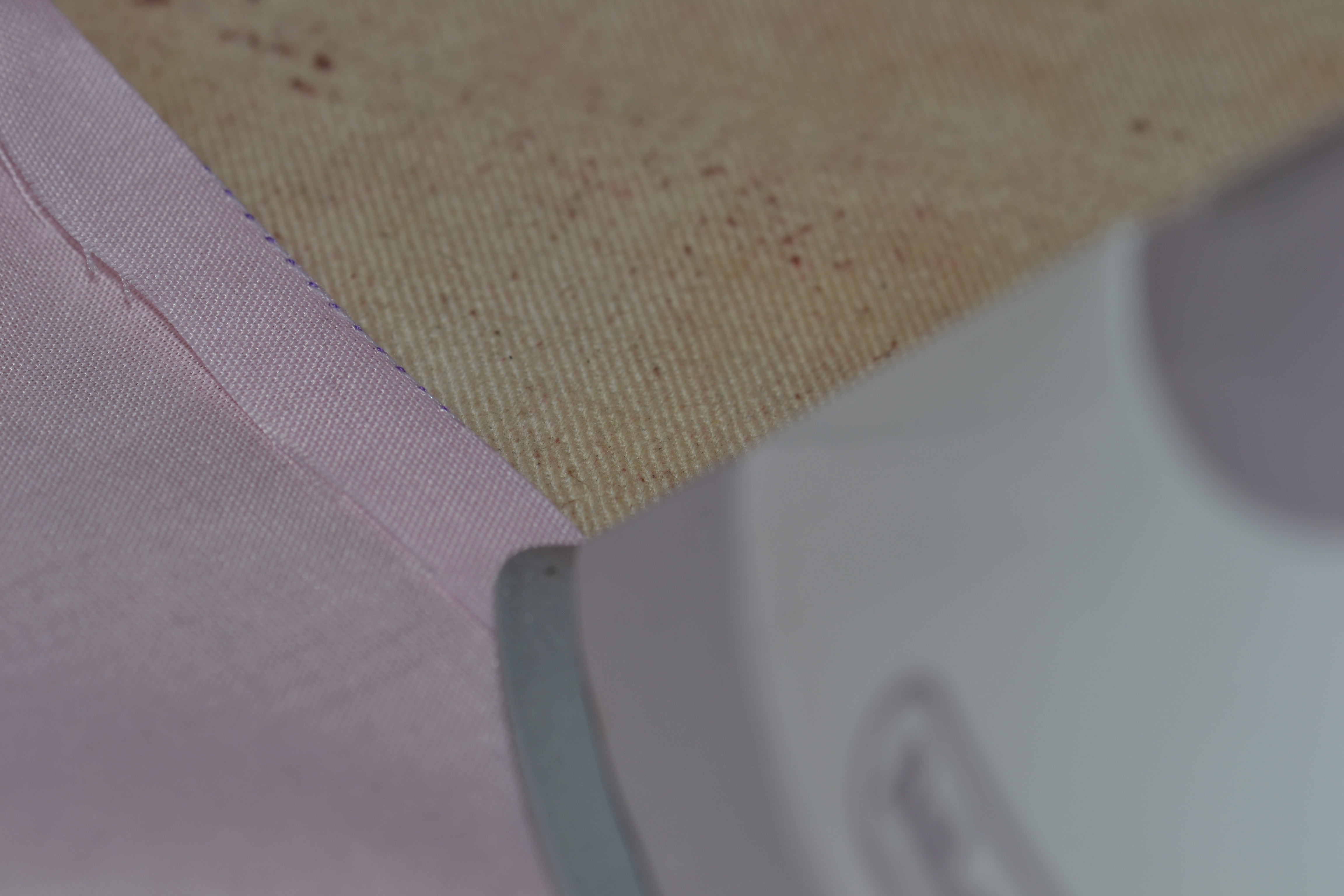 Take your garment to the ironing board and press the bottom of the hem up toward the inside exactly along the stitching line. The stitches should form a slight ridge on the edge.