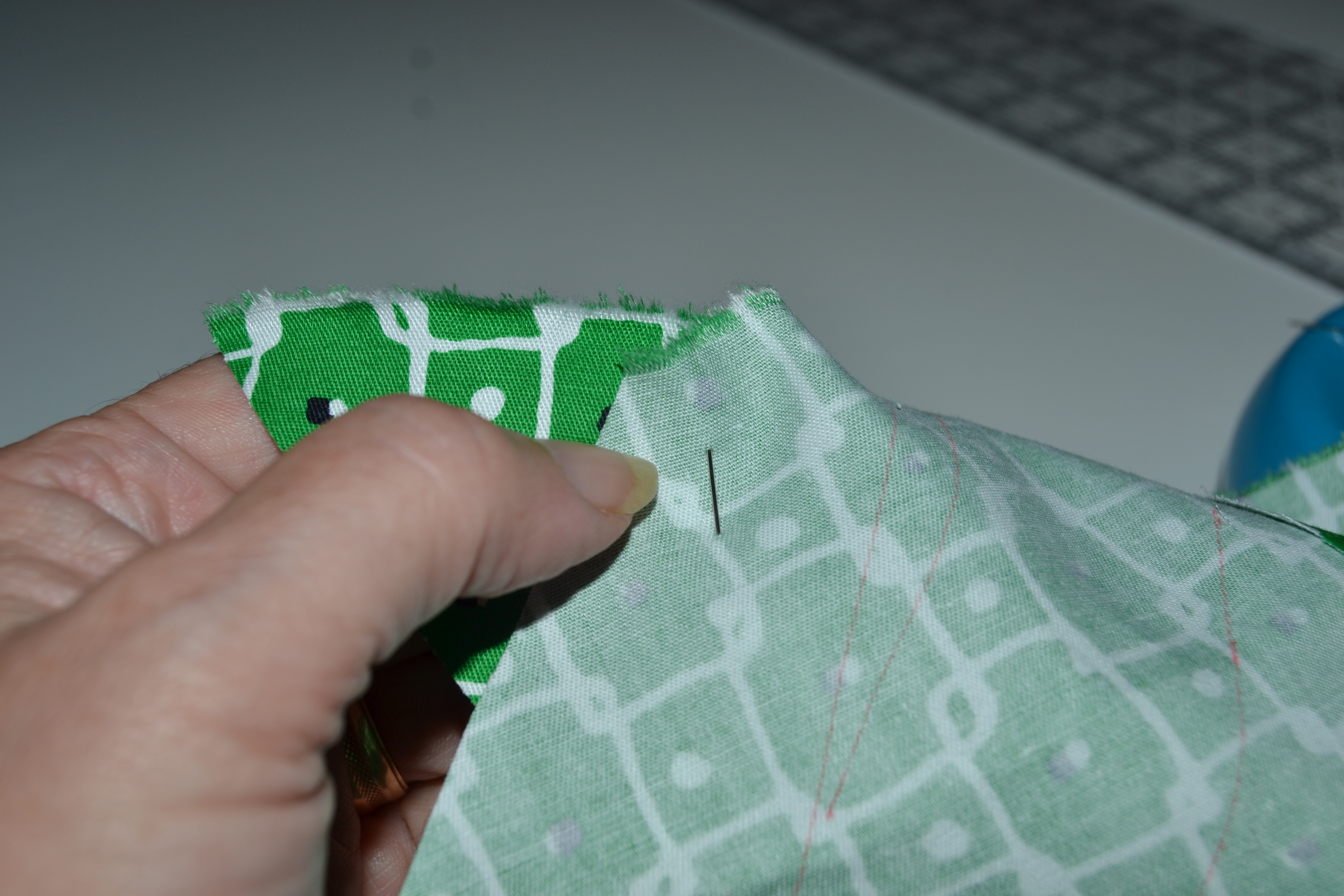 With the fabric right sides together, match the pin to the bottom left hand side of the fabric.