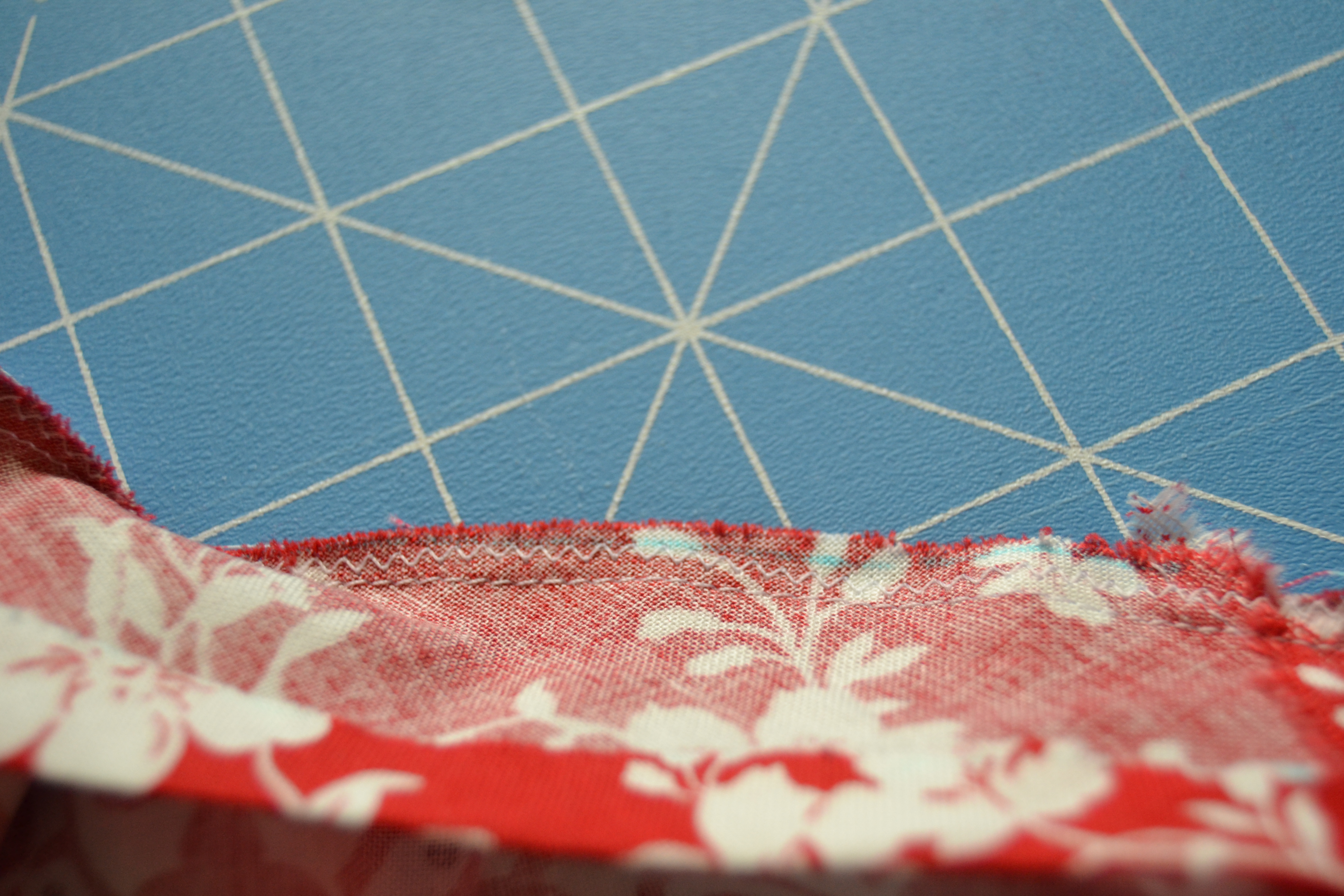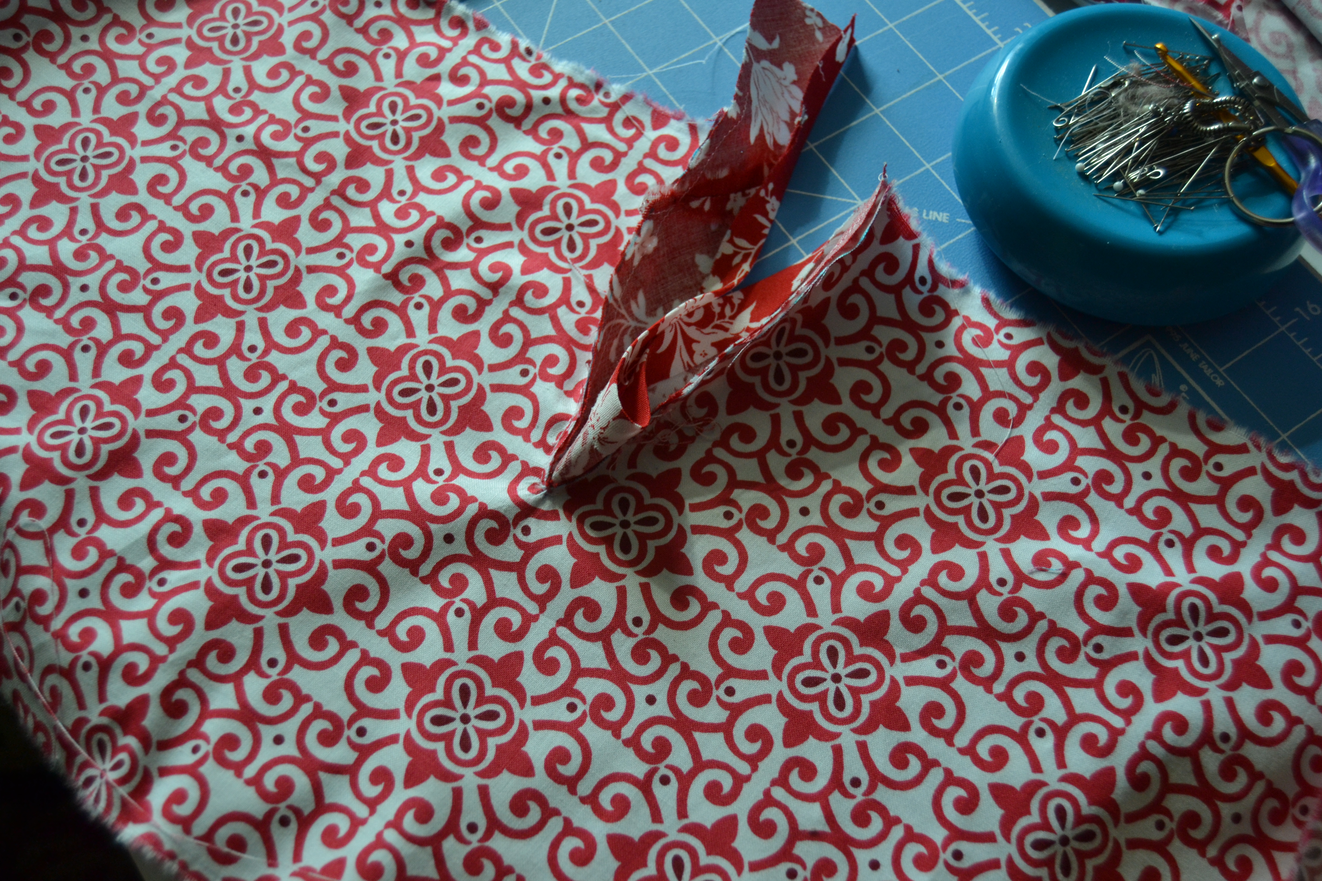 Starting with a 3/8″ seam allowance, sew down to the point, tapering the seam allowance to next to nothing, but not nothing.