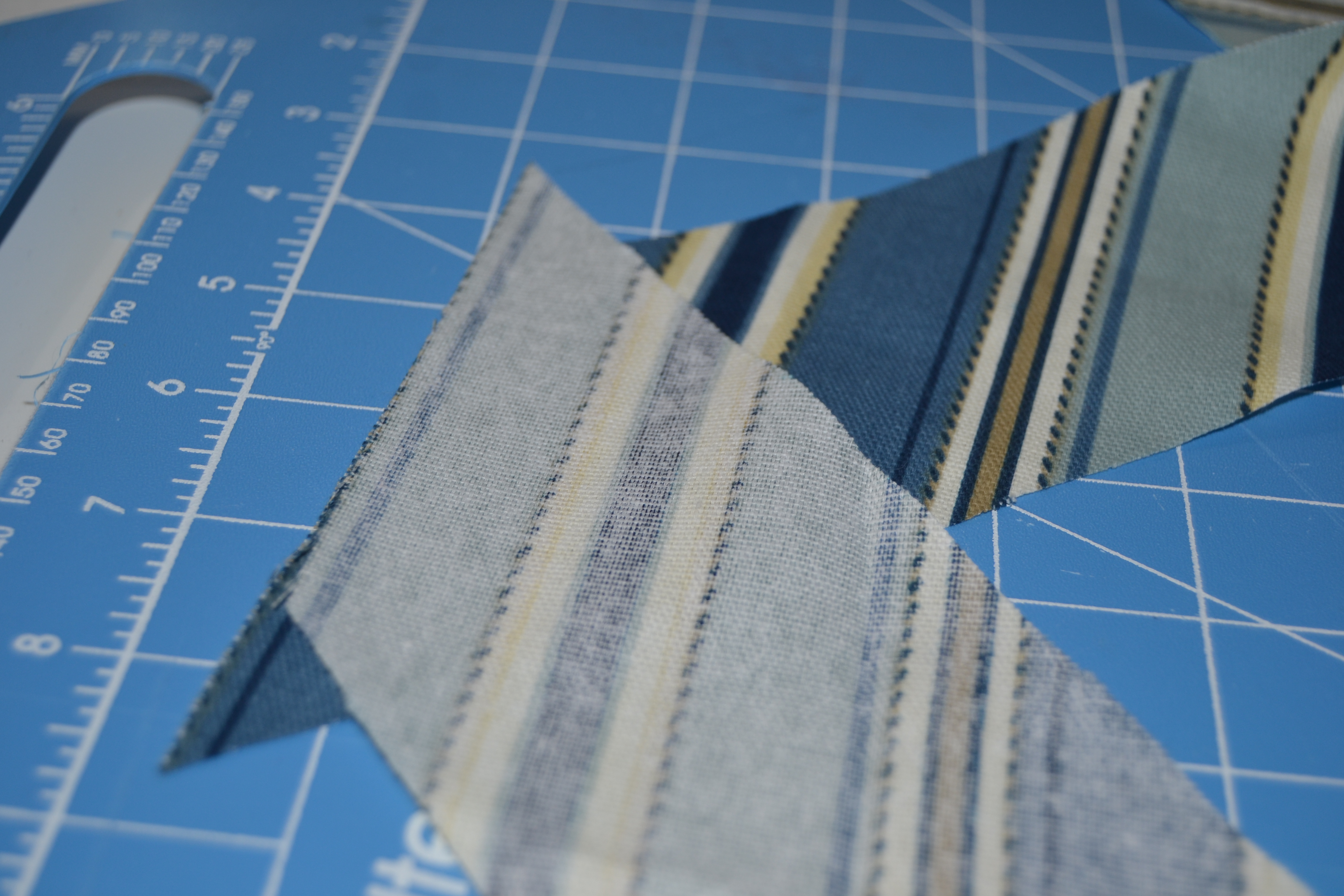 If you’re working with just a few strips, sew the strips together, sew them together at an angle so the line of stitching is on the cross or straight grain of the fabric. I’m using a stripe to make that easy to see. Offset the strips so you will have a straight strip when you’re done sewing it together.