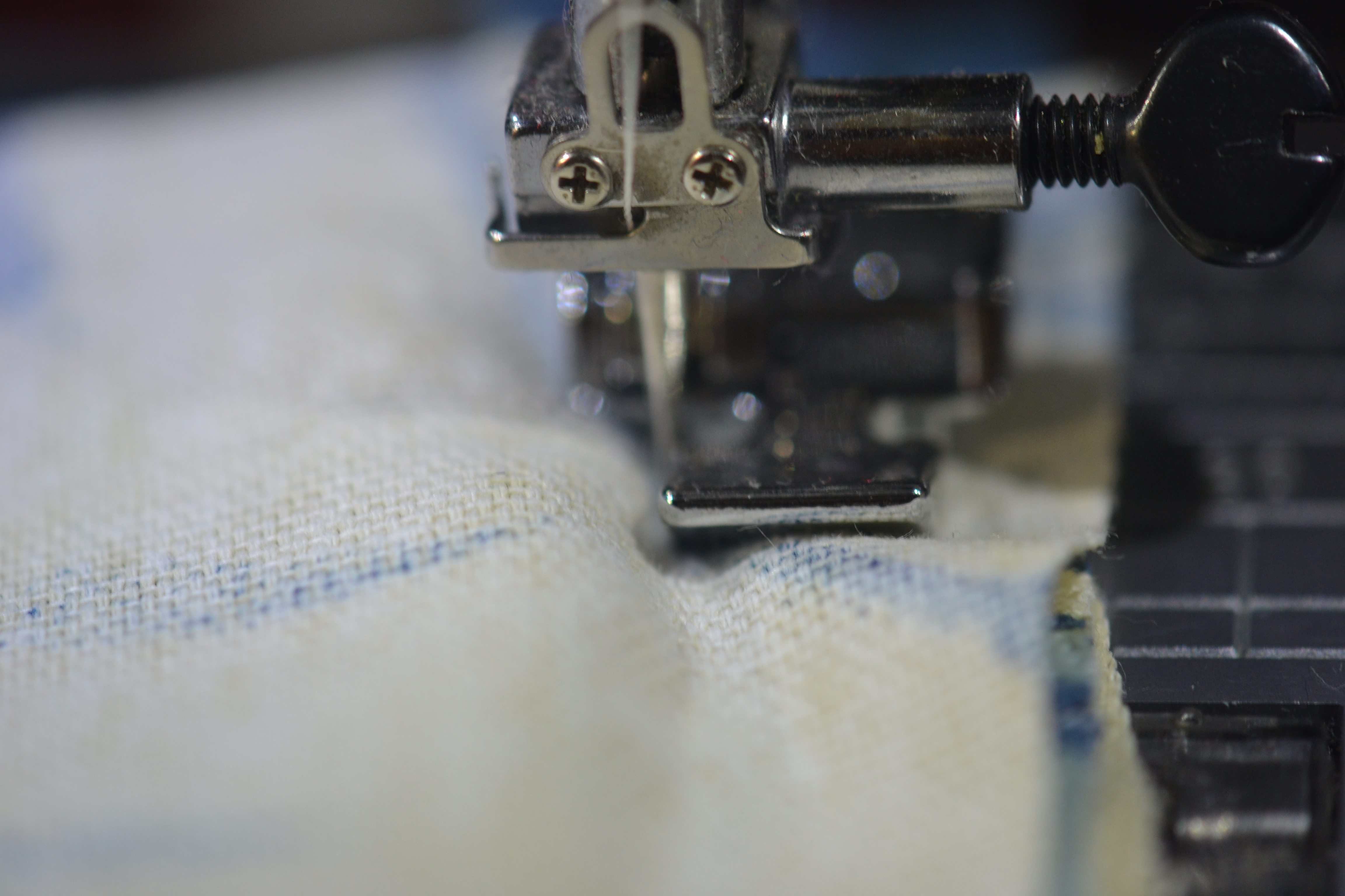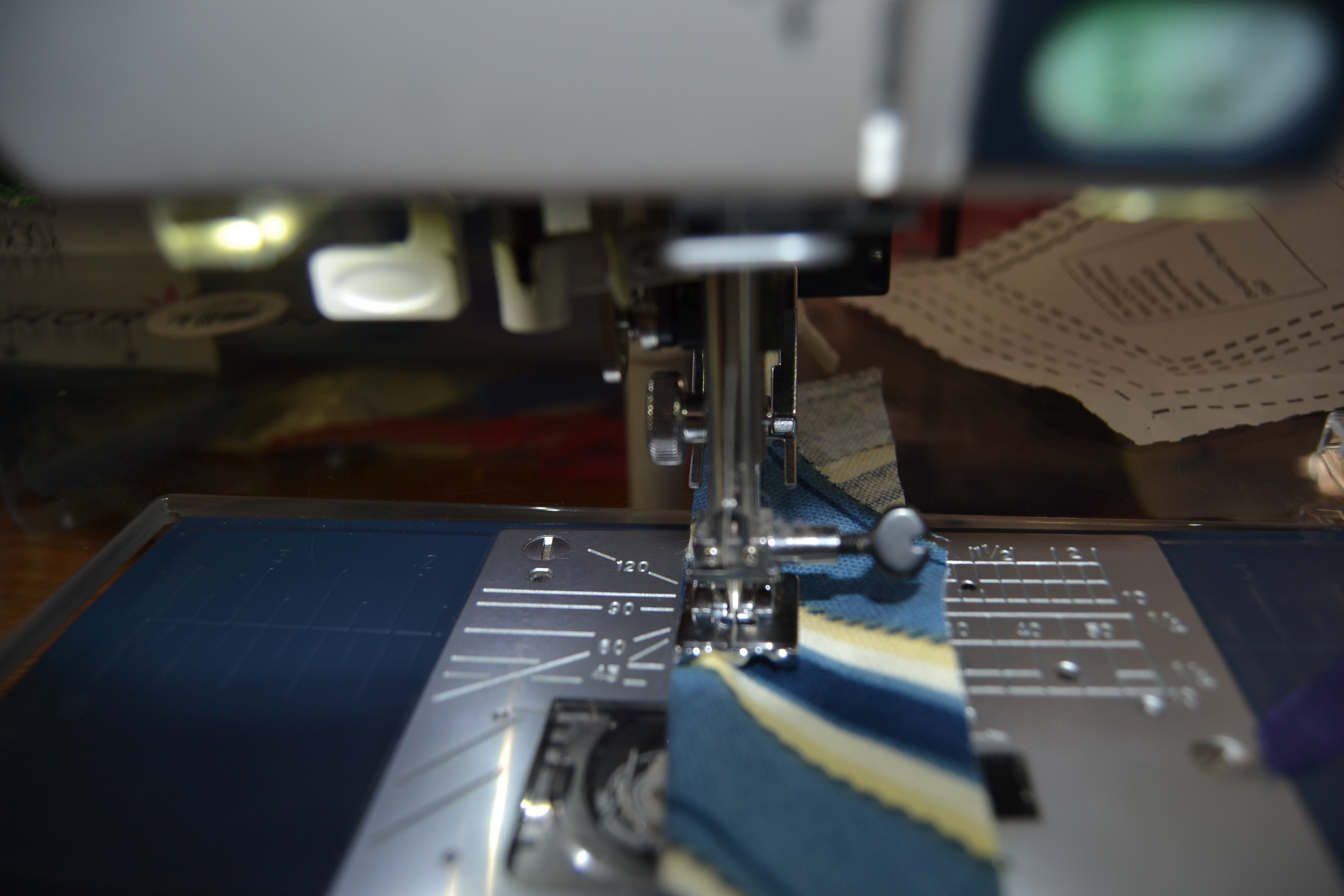 Attach either the piping foot or the zipper foot to your machine. Adjust the needle until it is right up against the filler cord, then back it away a little. This is so when you attach the piping to your project, the stitches you made when you constructed the piping won’t show.