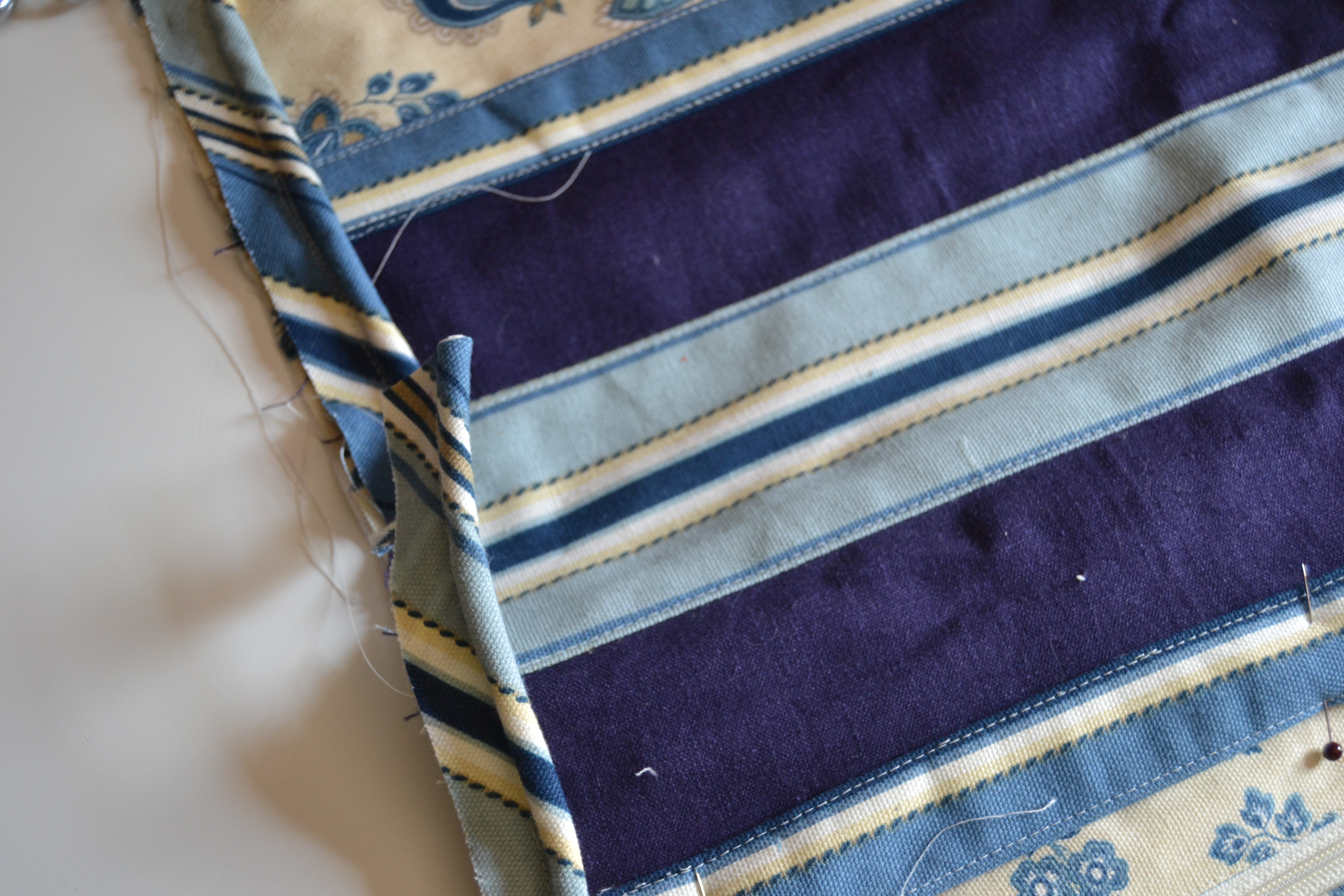 You can pin the piping to itself and carefully sew over the pin, but a better solution is to pull on the piping cord until you have enough exposed to cut off so it will be eliminated from the seam allowance. Now your sewing machine can easily sew over the bias tape, and you have a perfect join. The fuzzies are because I re-used the same seam. My camera sees things I can’t. lol