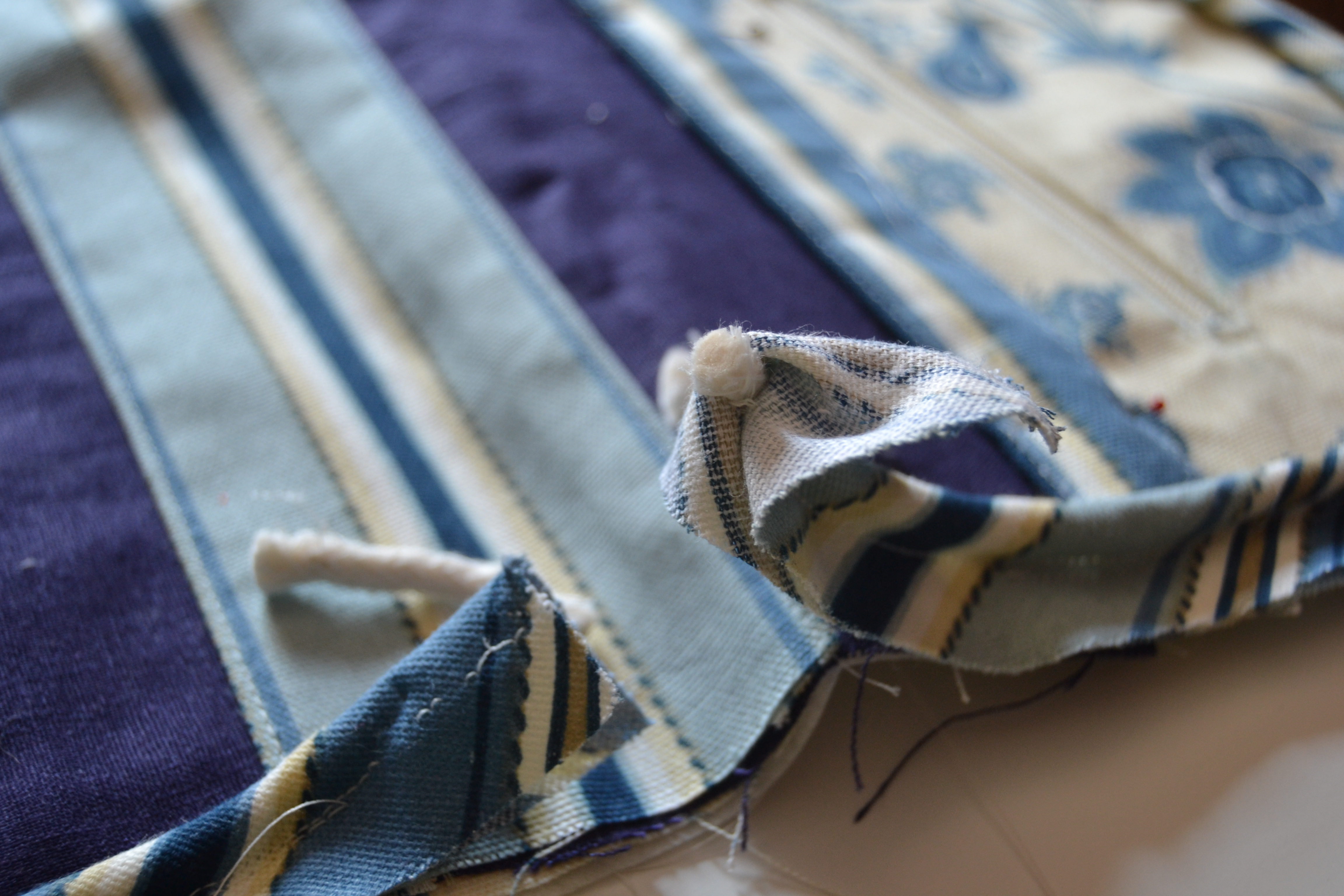 Now that you have your piping made and sewn on, what do you do when need to join piping to itself? The primary concern if you’d like your piping to look neat, tidy, and professionally done is to choose a method that eliminates as much bulk from the seam allowances as you can.